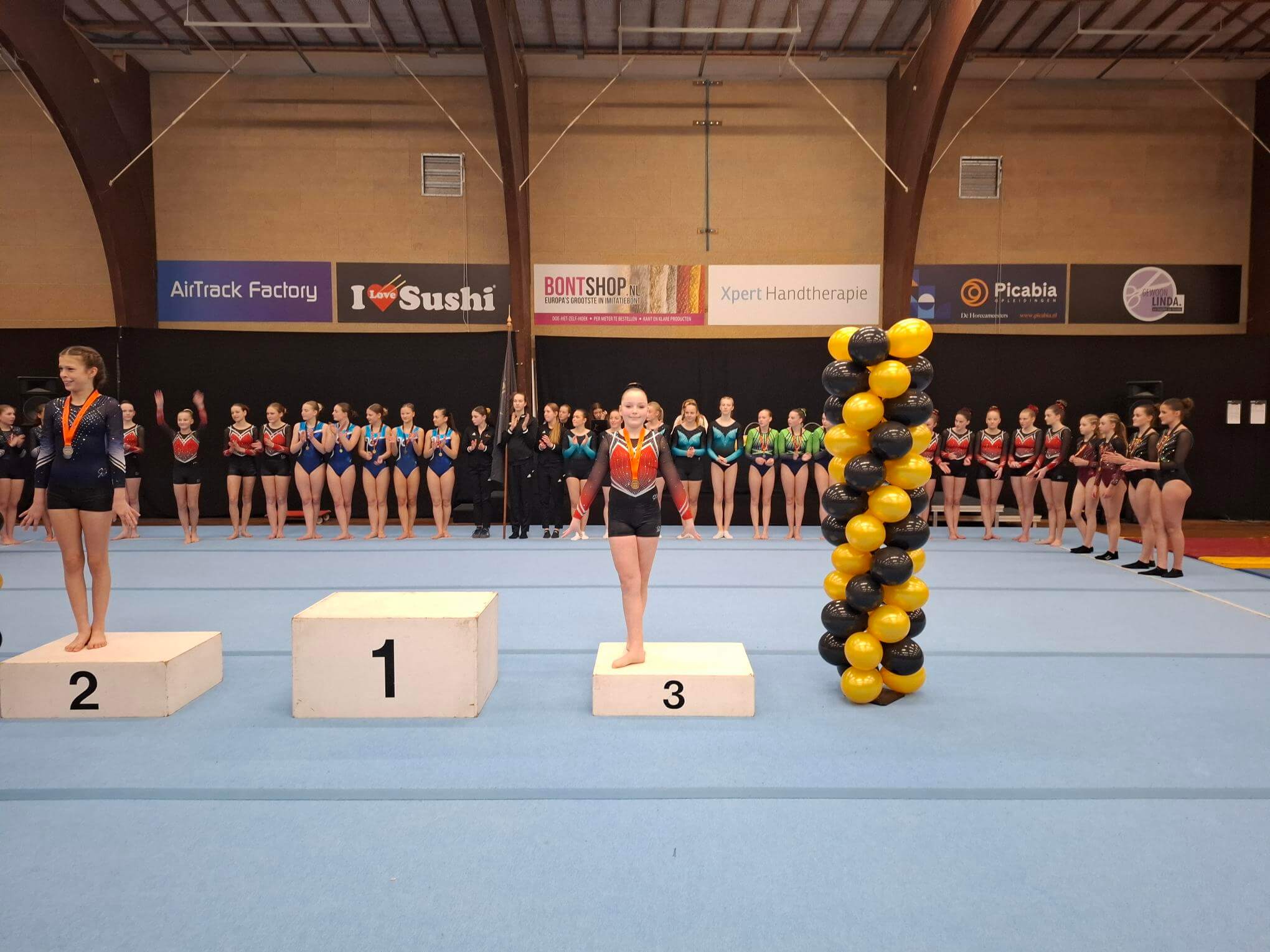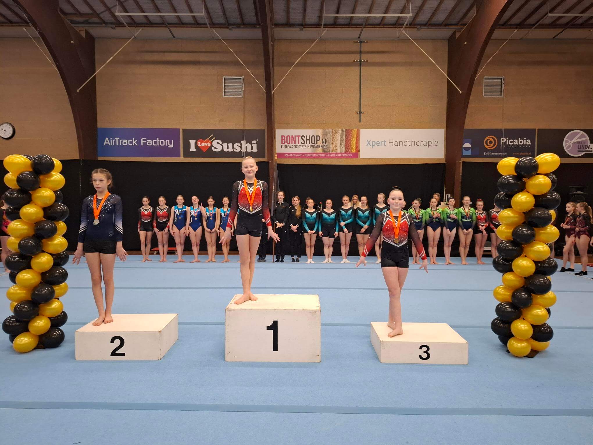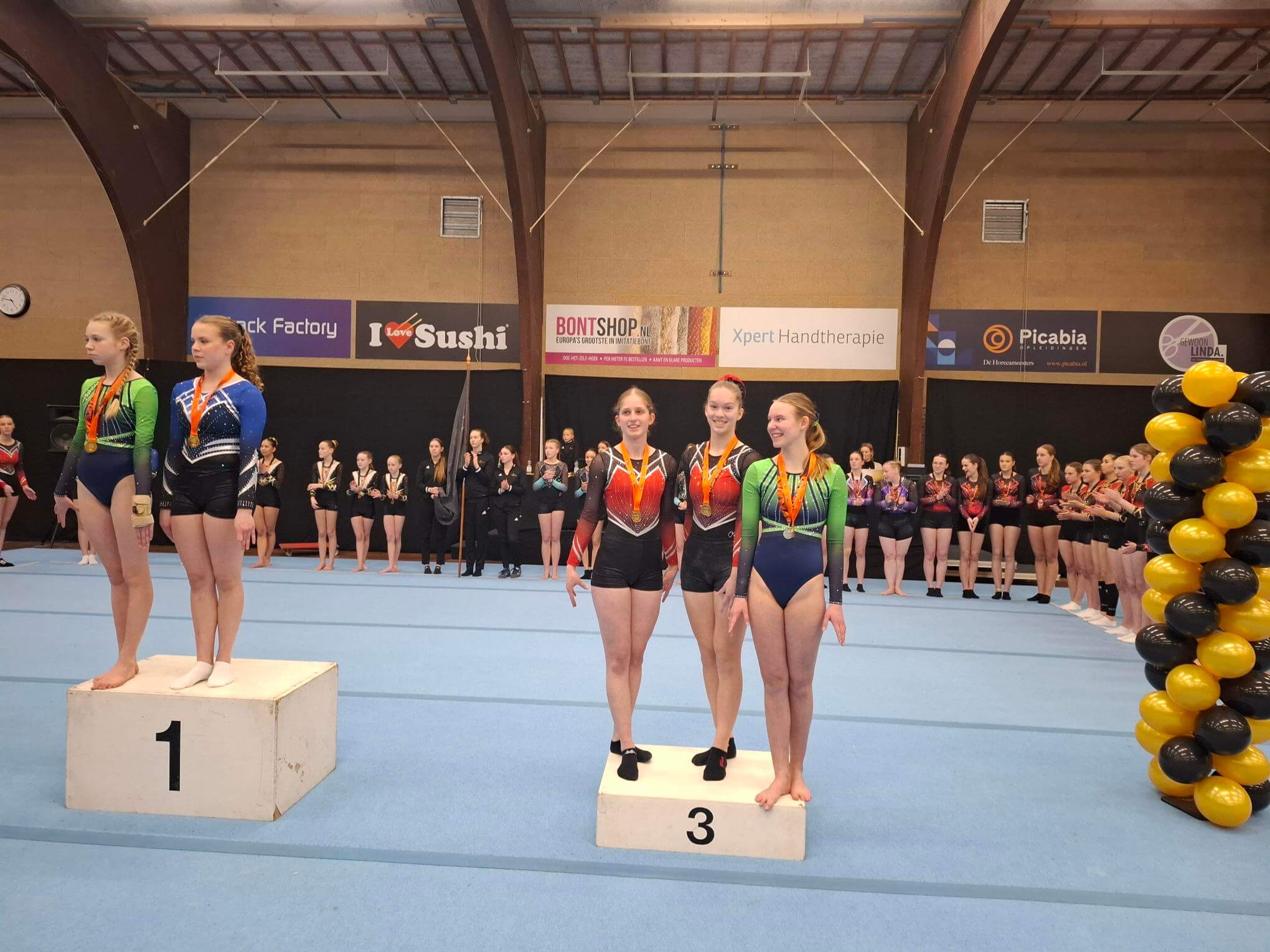 Het team van: Naomi, Stacy, Fajah, Meike en AmberRoos zijn 4de geworden als team, maar er zijn toch veel individuele verbeteringen geturnd. Fajah wist een prima balk te turnen en was AmberRoos weer in staat goede oefeningen te laten zien op balk en vloer na een blessure. Zo werd bij de jeugd Naomi Bos 4de en Fajah Hoeve 5de.